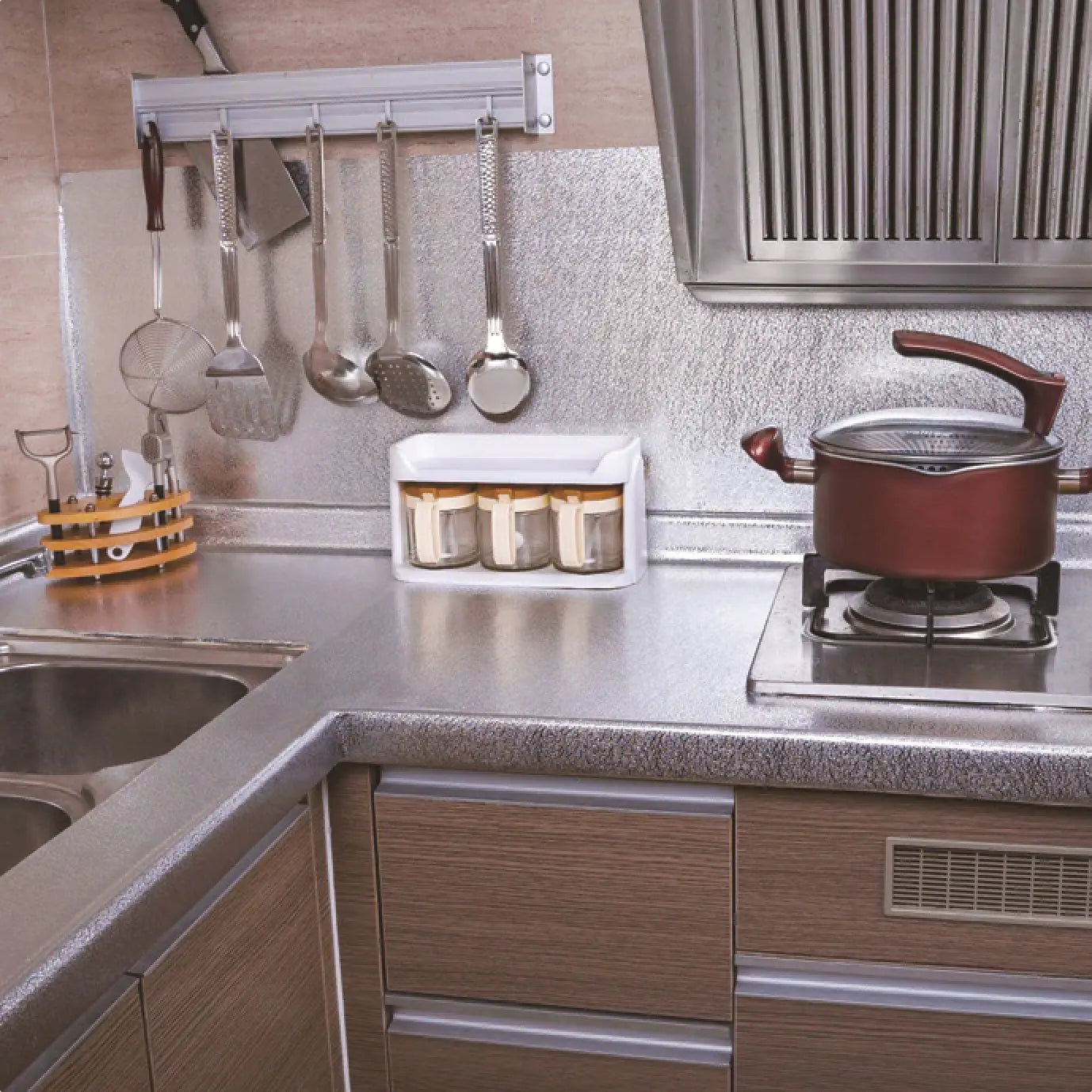 Nuestro papel aluminio se pega directamente en la pared, creando una barrera protectora contra las manchas. Además, es resistente al calor y fácil de limpiar.