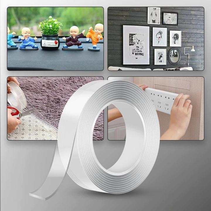 Gracias a la nueva tecnología nano y material adaptable, cinta de agarre nano se adhiere a todas las superficies. Resistente y duradero, transparente, fácil de quitar, no deja rastros en la pared o cualquier superficie.